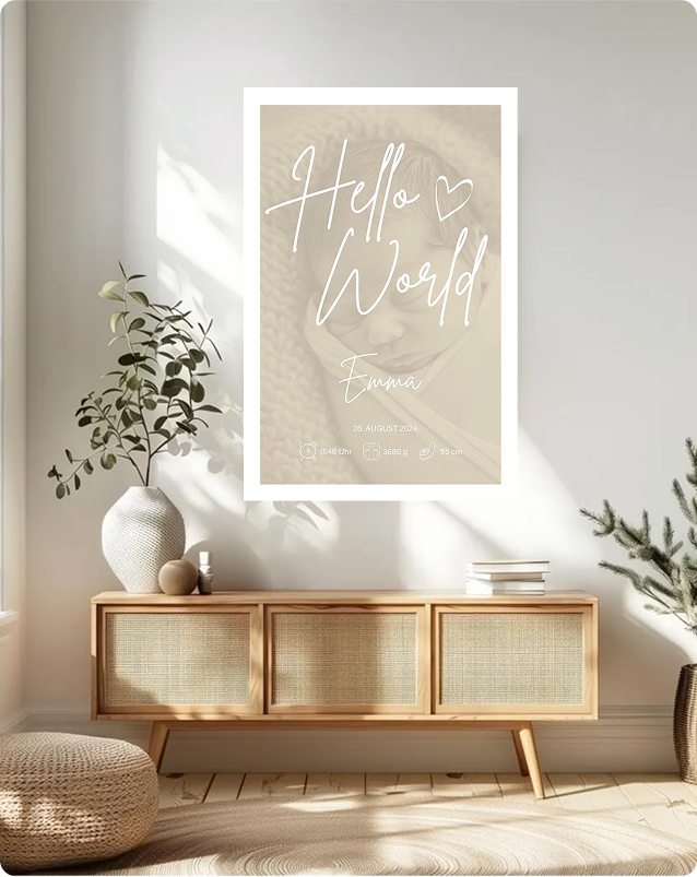 Jedes unserer Motive trägt eine Geschichte in sich – egal ob Hochzeit, Geburt, Urlaub oder einfach ein stiller Lieblingsmoment. Du kannst es personalisieren, farblich anpassen und mit deinen eigenen Worten versehen.